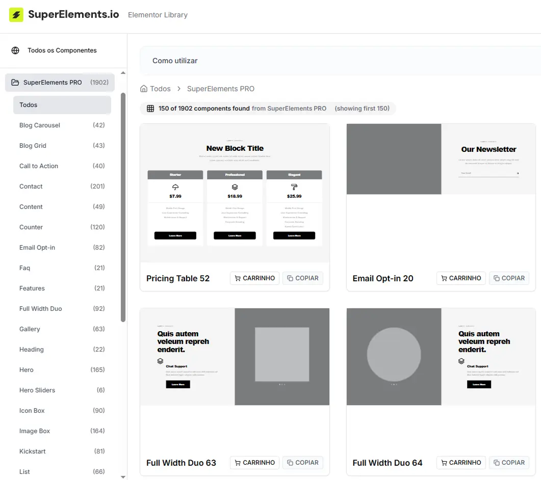 Copie direto do SuperElements e cole no seu projeto. Um clique. Funciona em qualquer site WordPress com Elementor.